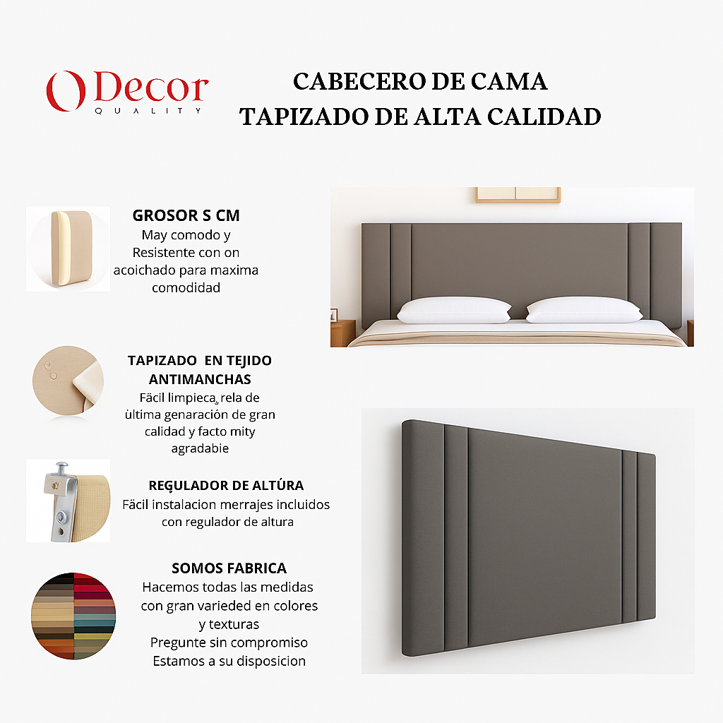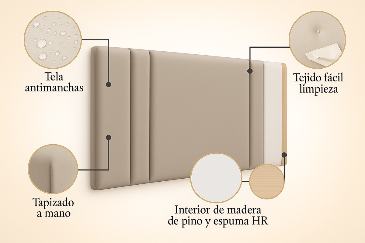 Cabecero de cama CADIZ tapizado en tejido antimanchas de alta calidad, Diseñado para aportar modernidad, confort y elegancia al dormitorio. Su silueta, marcada por líneas geométricas , aporta un aire contemporáneo y acogedor que lo convierte en la pieza central de la habitación. Una elección ideal para quienes buscan un diseño actual, con practicidad y fácil mantenimiento.” .